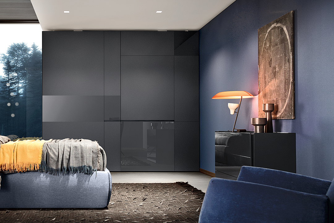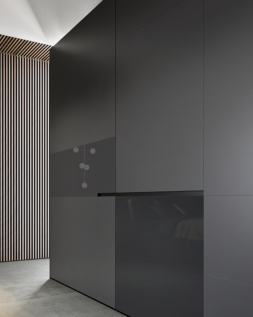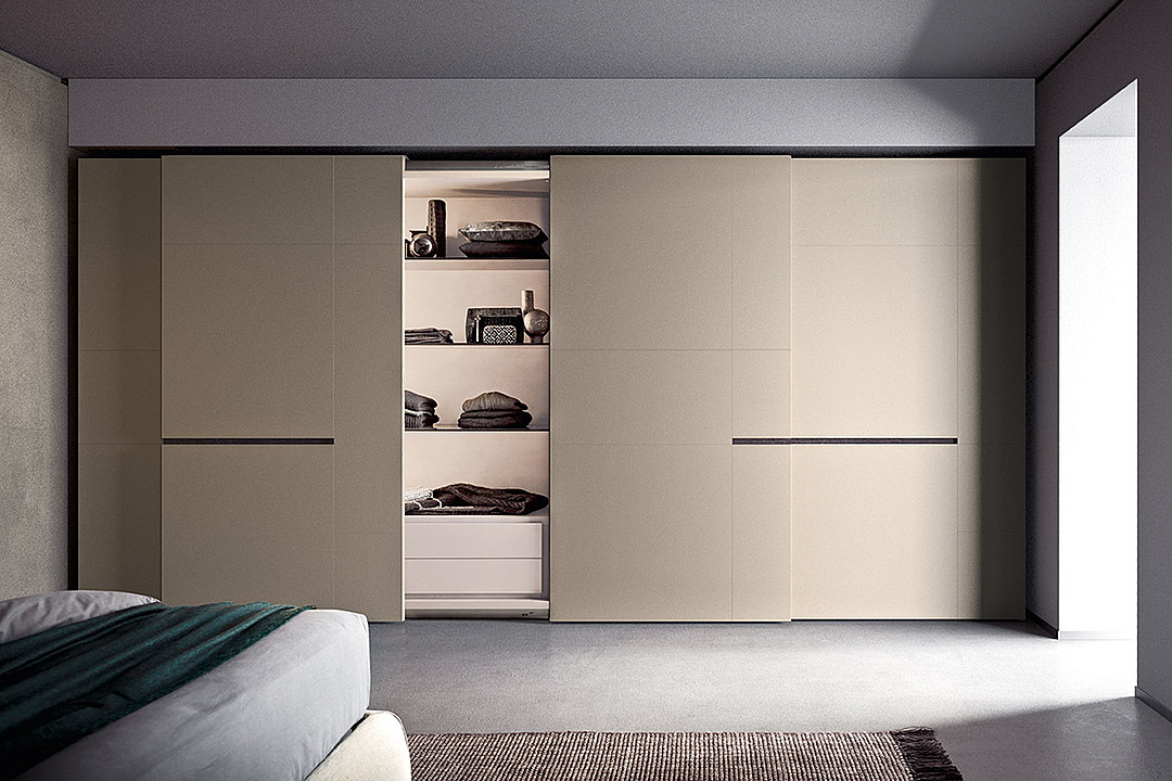 A refined design with a stylish, eccentric appeal. The geometric door decor offers a juxtaposition of gloss and matt glass surfaces. Various-sized rectangles in different proportions stem from a modern artistic language. The handle has a strong graphic impact, cutting across the doors in a horizontal line that enhances the beauty of the composition. Available matt lacquered or in wood, it is recessed inside the panel of sliding or flush sliding doors.