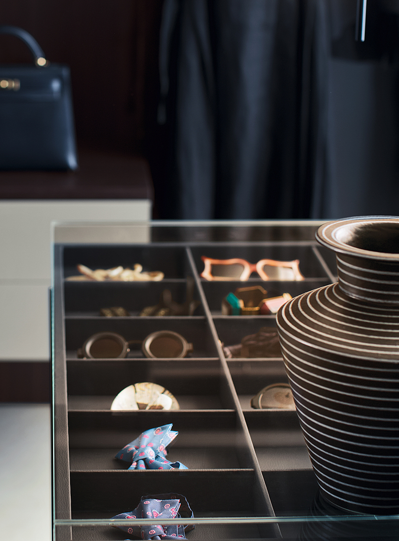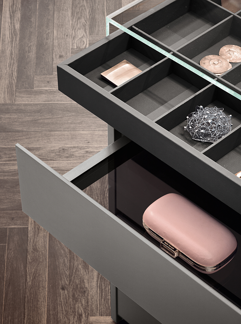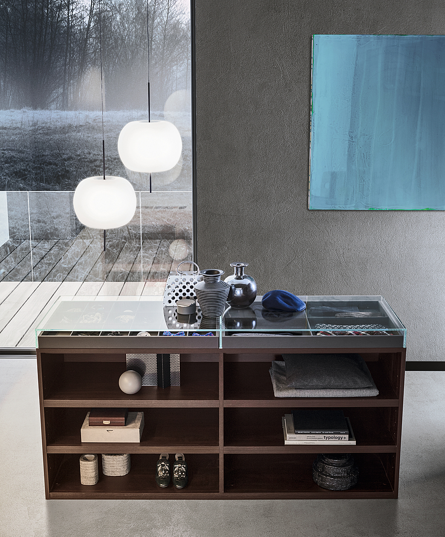 The Island module appears like a dreamy oasis in the middle of the room: an island for walk -in closets evoking the most exclusive boutique furnishings, directly in your home sea. Thanks to the possibility of being equipped with drawers, shelves and shoe-racks, it’s an useful and versatile shelter for any kind of wardrobe; moreover, it offers space for jewels and valuables, or for emotional and simple but priceless memories, to lull with care above a velvet lining, inside an elegant display cabinet that comfortably contains and safeguards your most precious treasure.