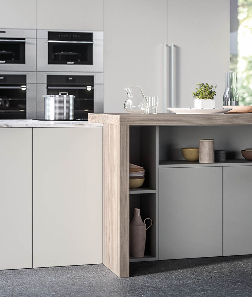 Columns and island in Fenix Grigio Efeso Snack bar in Greige finish.