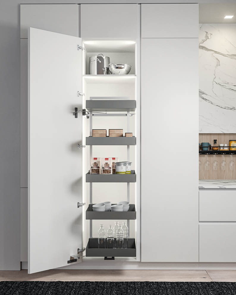 Base units and columns in Ghiaccio matt lacquer. Cover in Brunito