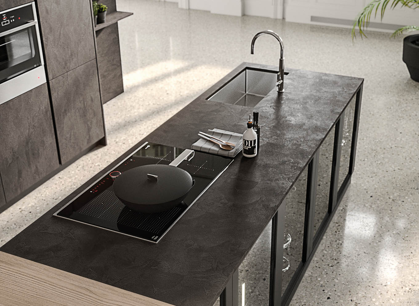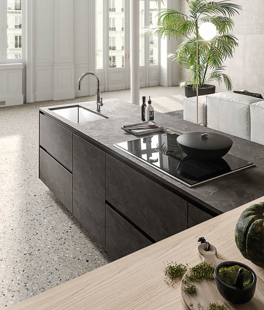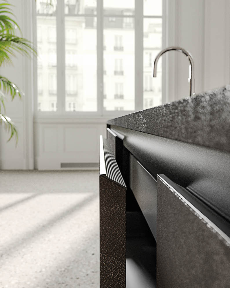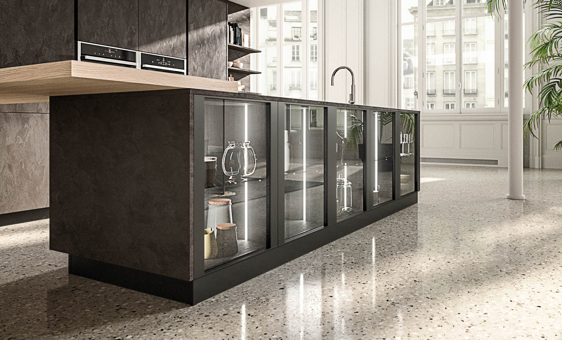 Arrangement entirely in Materia Vulcano. Snack top in Paglia finish. City door profile in black aluminium. External side of island with