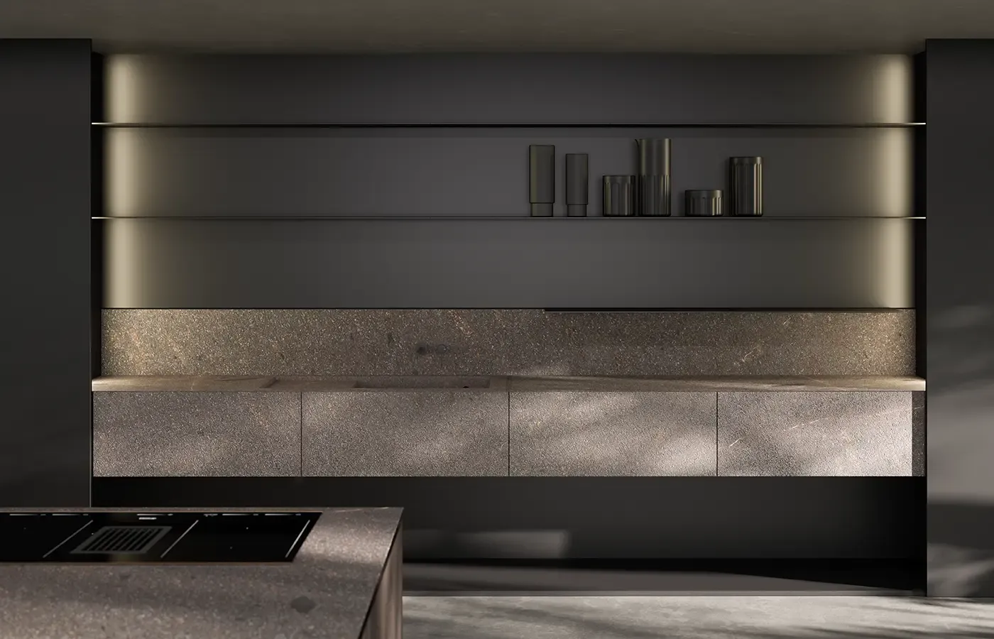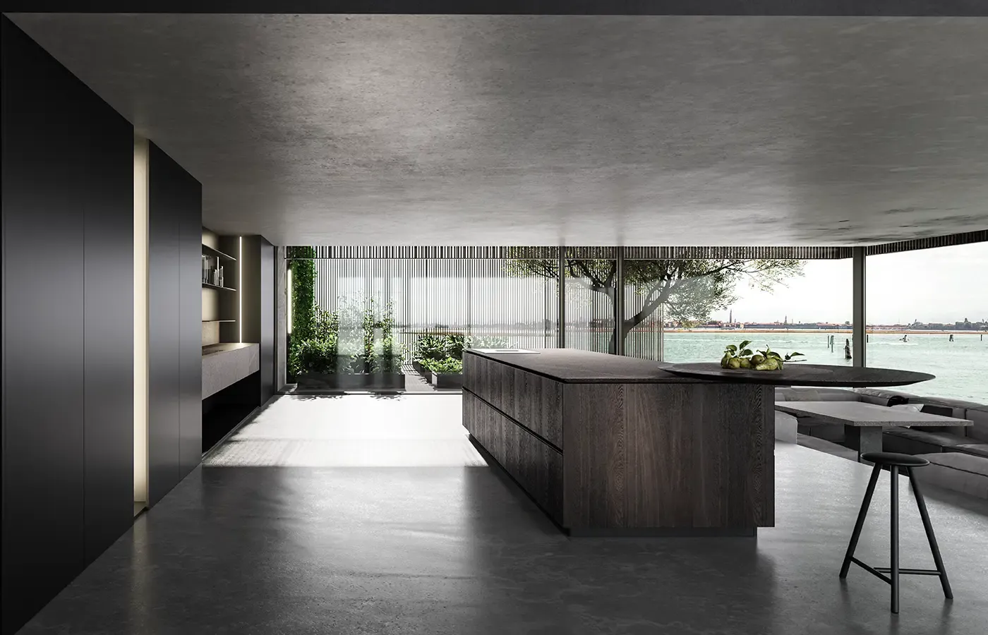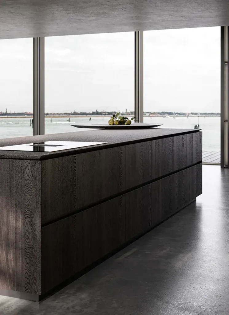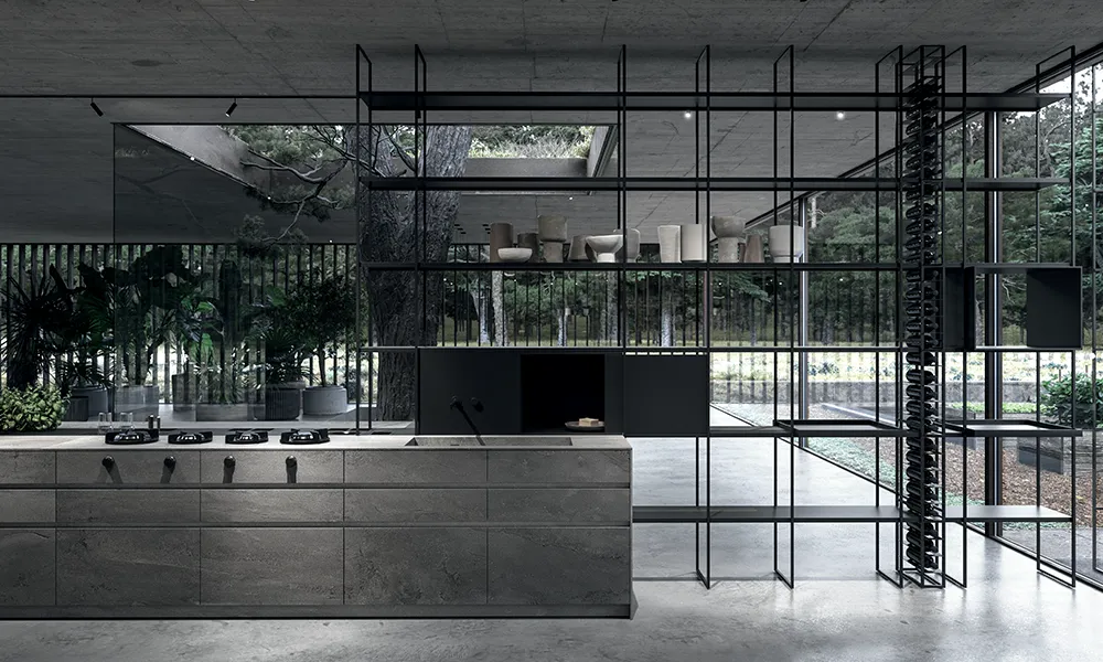 Eterea kitchen by The Cut extends beyond its natural space via a solid dynamism of stone, wood and metal. Light beams run along its vertical walls to convey the minimalist