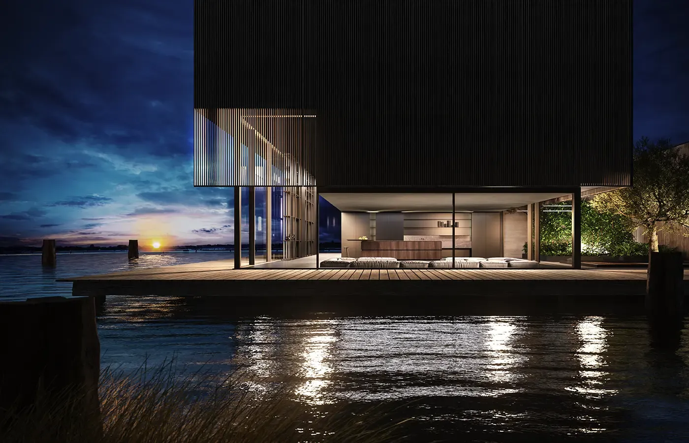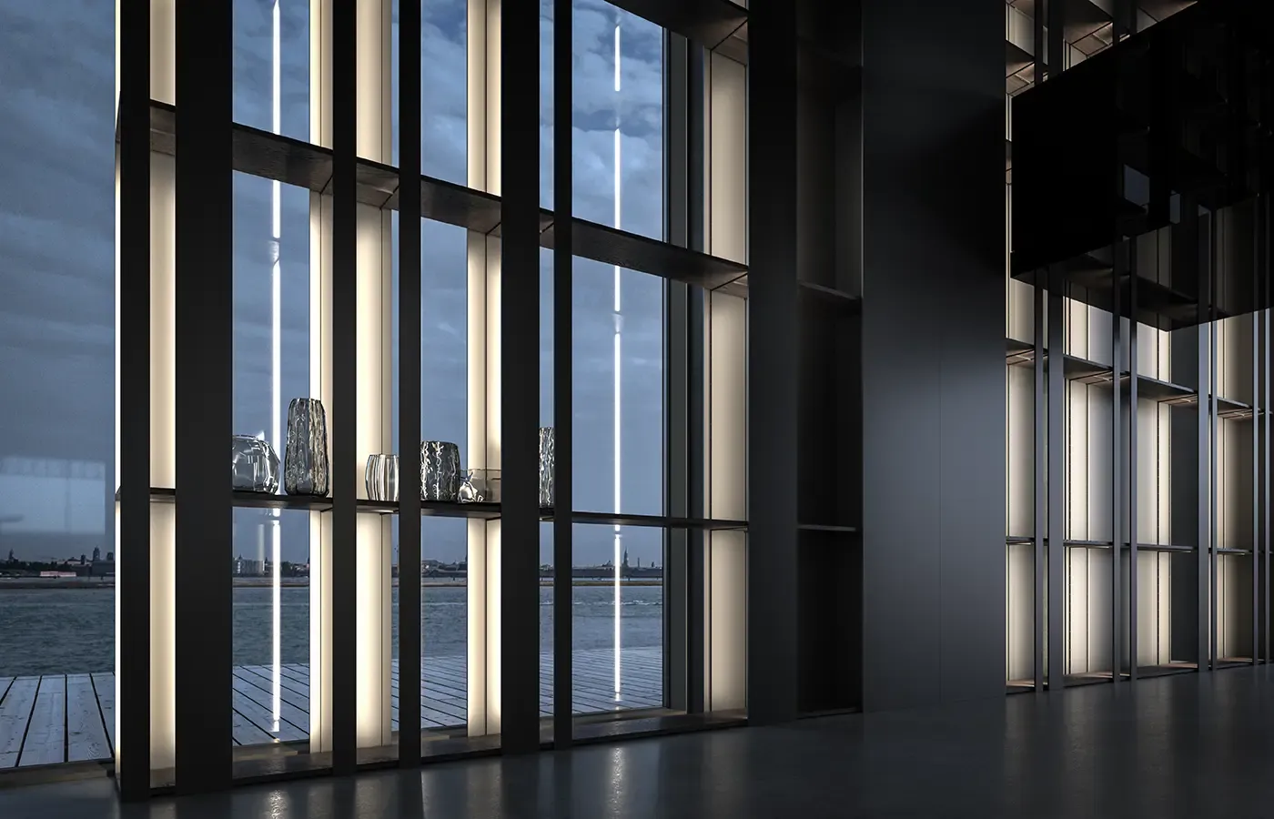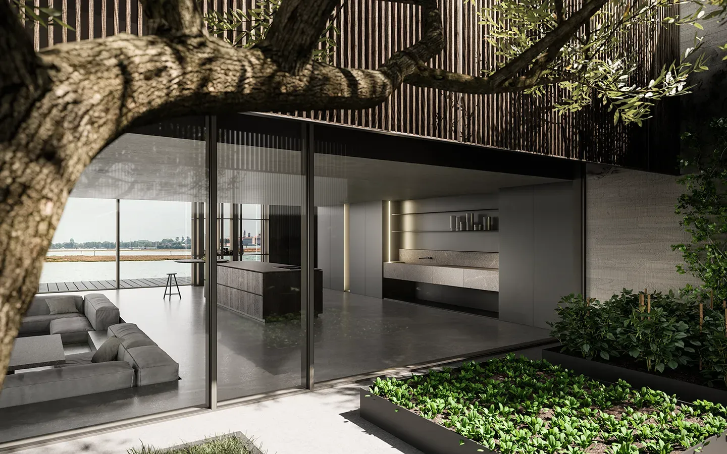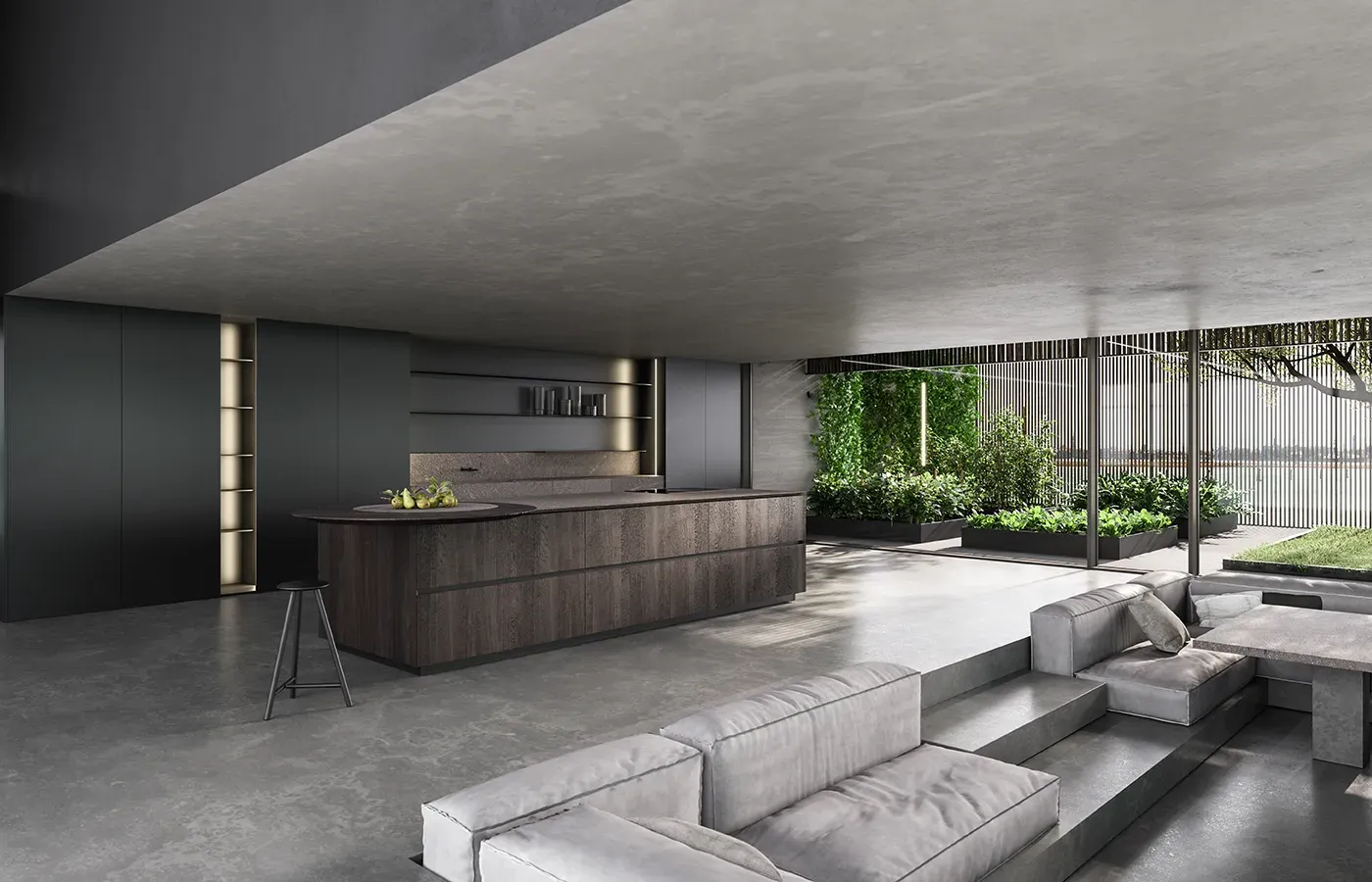 Eterea kitchen by The Cut extends beyond its natural space via a solid dynamism of stone, wood and metal. Light beams run along its vertical walls to convey the minimalist